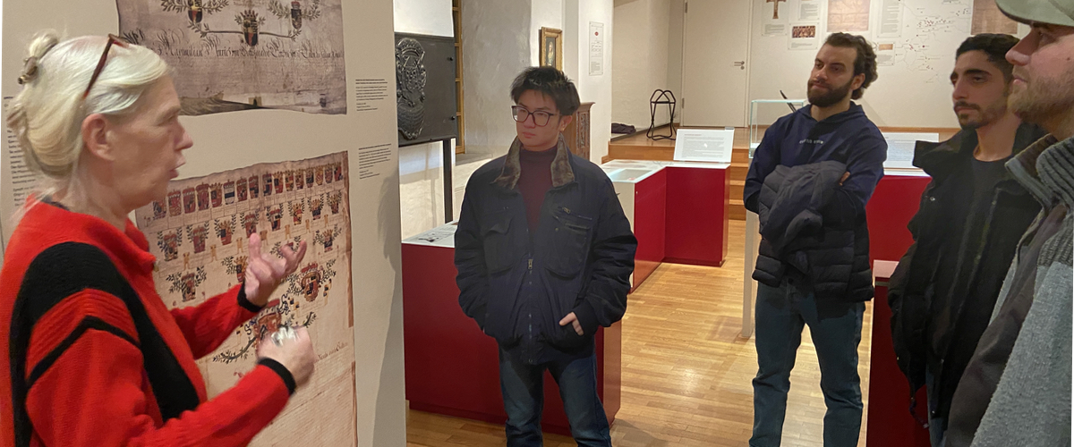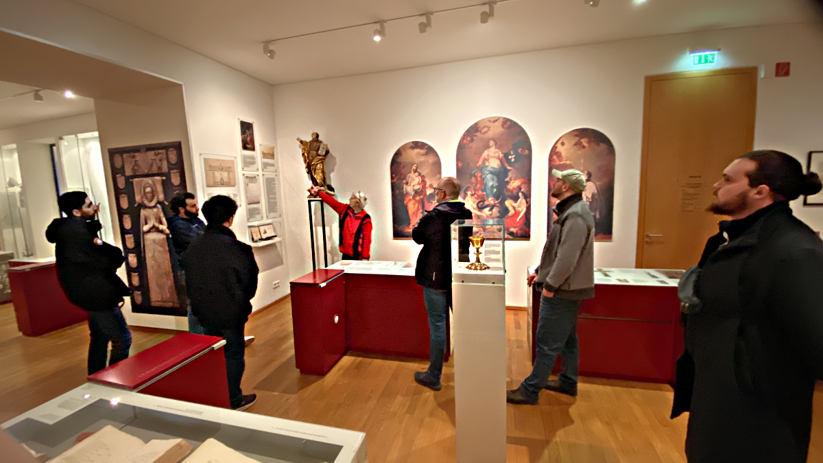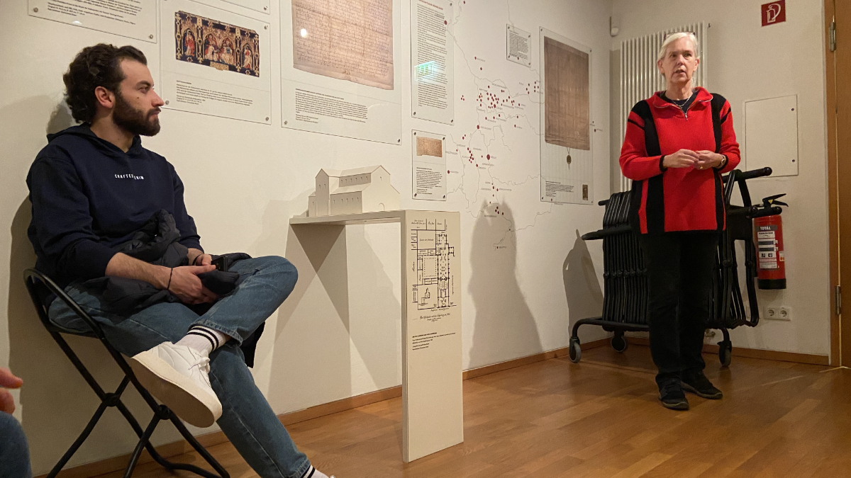 Souveräne Expertin für die Führung in Schloss und Dauerausstellung war Birthe Marfording vom Kulturamt Essen, die als Historiker und Buchautorin mit der Geschichte von Stift, Schloss und Park eng vertraut ist. Sie gab bei ihrer knapp zweistündigen Führung einen breiten Überblick zur Entwicklung des hochadeligen Damenstiftes in der Grenzlage zwischen Franken und Sachsen von der Gründungszeit um 850 bis heute, erinnerte an den Stifter Altfrid von Hildesheim, die großen Kaiserhäuser und die bedeutenden Persönlichkeiten an der Spitze des Stiftes. Darüber hinaus erläuterte sie die Hintergründe des spätestens seit der Reformation manifesten Streits mit dem Rat der Stadt, den Einfluss benachbarten Mächte, die vielen Kriegszüge durch die Region und die religiösen wie wirtschaftlichen Schwerpunkte des milden Frauenregiments, das – deutschlandweit in dieser Weise einzigartig – fast genau 1000 Jahre währte.