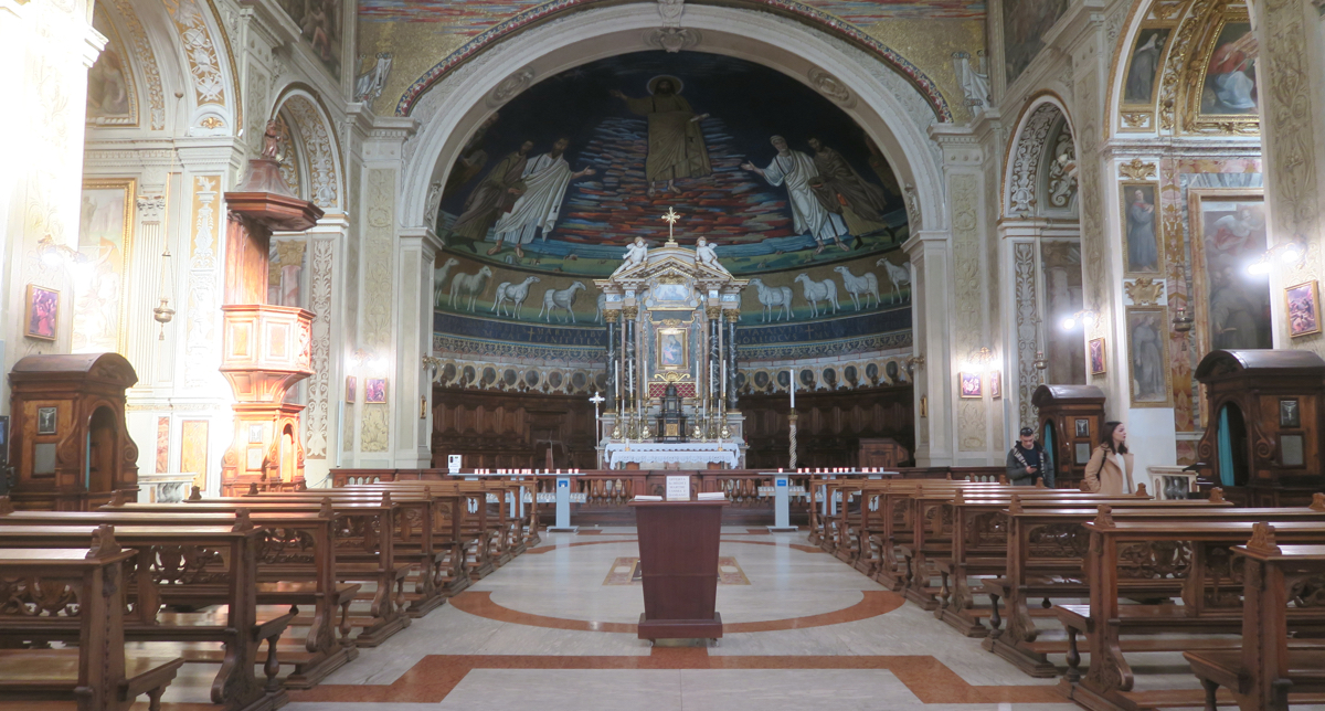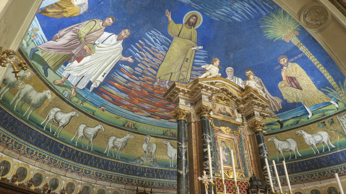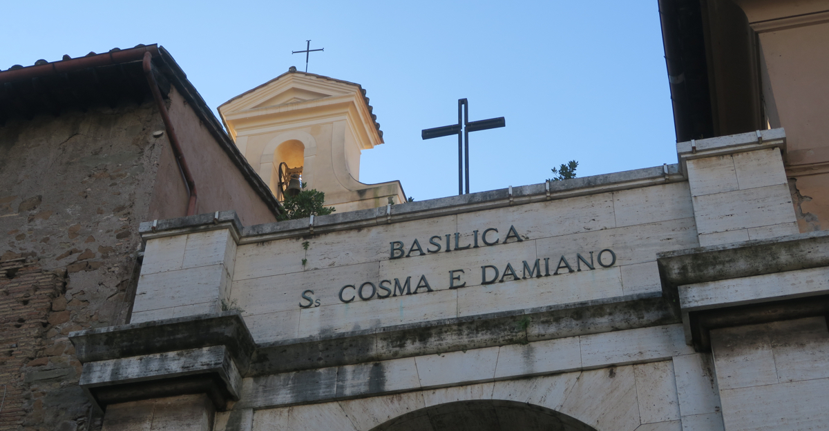 Basilika Santi Cosma e Damiano an der Via Sacra auf dem Forum Romanum mit dem um 527 unter Papst Felix IV entstandenen rund 16 Meter breiten Apsismosaik der Heiligen Cosmas und Damian, die sich dem Weltenrichter von links und rechts nähern