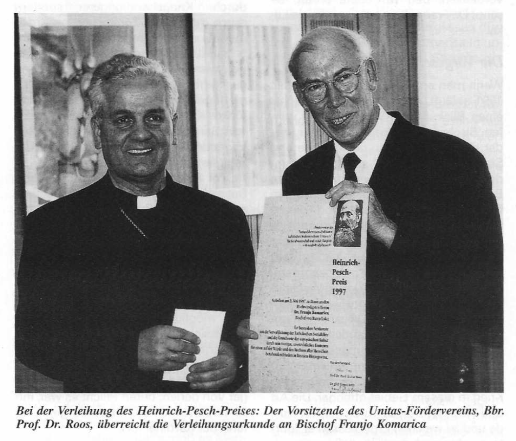 Die Unitas Ruhrania trug ihm damals die Ehrenmitgliedschaft an, 1997 wurde er im Unitas-Verband als Ehrenmitglied aufgenommen mit dem Heinrich-Pesch-Preis ausgezeichnet. Auch in ganz praktischer Hinsicht war der Krieg im Unitas-Verband nicht ohne Reaktion geblieben: Auf Betreiben der Unitas Ruhrania in Essen wurde ein mehrjähriges Soziales Projekt in Sarajewo aufgelegt und das zerstörte große Waisenheim im Mutterhaus des Ordens der „Dienerinnen vom Kinde Jesu“ wiederhergestellt. Ein weiteres Projekt konnte mit der Einrichtung eines Internates für Schüler in Banja Luka verwirklicht werden.
