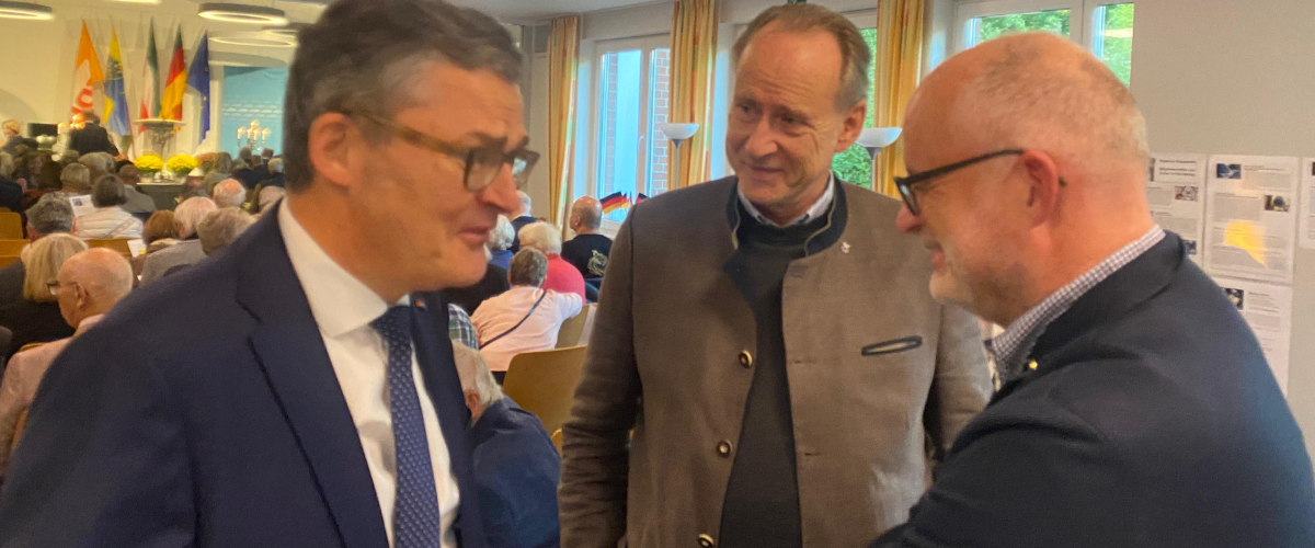 Bbr. Roderich Kiesewetter mit den Organisatoren der Festveranstaltung zum „Tag der Deutschen Einheit" 2024, (v.l.) Bbr. Thomas Kleinschnittger (Unitas-Salia, Unitas Ruhrania), Ratsherr Dirk Kalweit