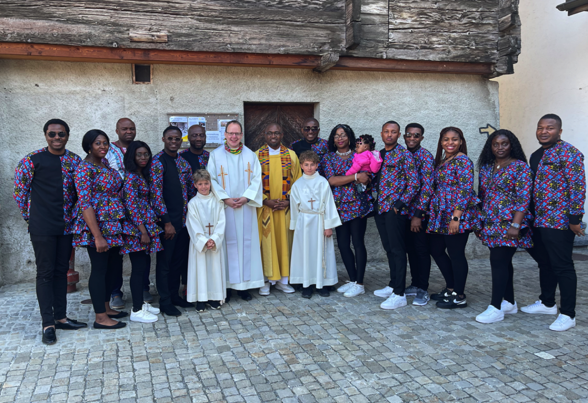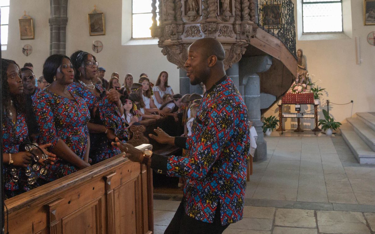 Bbr. Charles Onyeke vom Essener Unitas-Haus mit seinen „Devine Melody Choristers“ bei seiner kleinen Tournee in die Schweiz bei der Messe in St. Stephan in Susten/Wallis