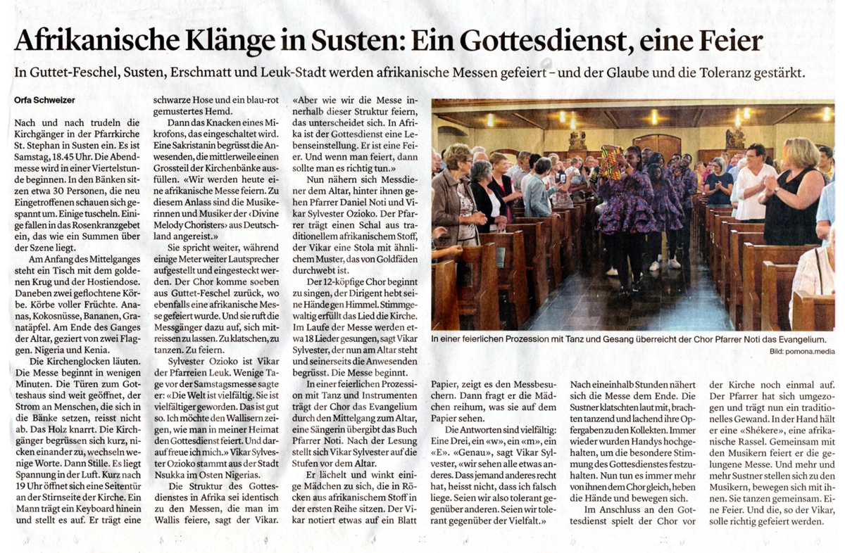 ESSEN. „Afrikanische Klänge in Susten“ - der 1840 gegründeten Traditionszeitung „Walliser Bote“ war es am 30. Mai einen großen Artikel wert. Die einzige deutschsprachige und älteste Zeitung im schweizerischen Kanton Wallis schrieb von der kleinen Tournee, die Charles Onyeke vom Essener Unitas-Haus mit seinen „Devine Melody Choristers“ in die Alpen unternahm. Es war ein „Familienbesuch“ bei Bbr. Vikar Sylvester Ejike Ozioko, von dem Orfa Schweizer in der Ausgabe des „Walliser Boten“ vom letzten Montag berichtete.