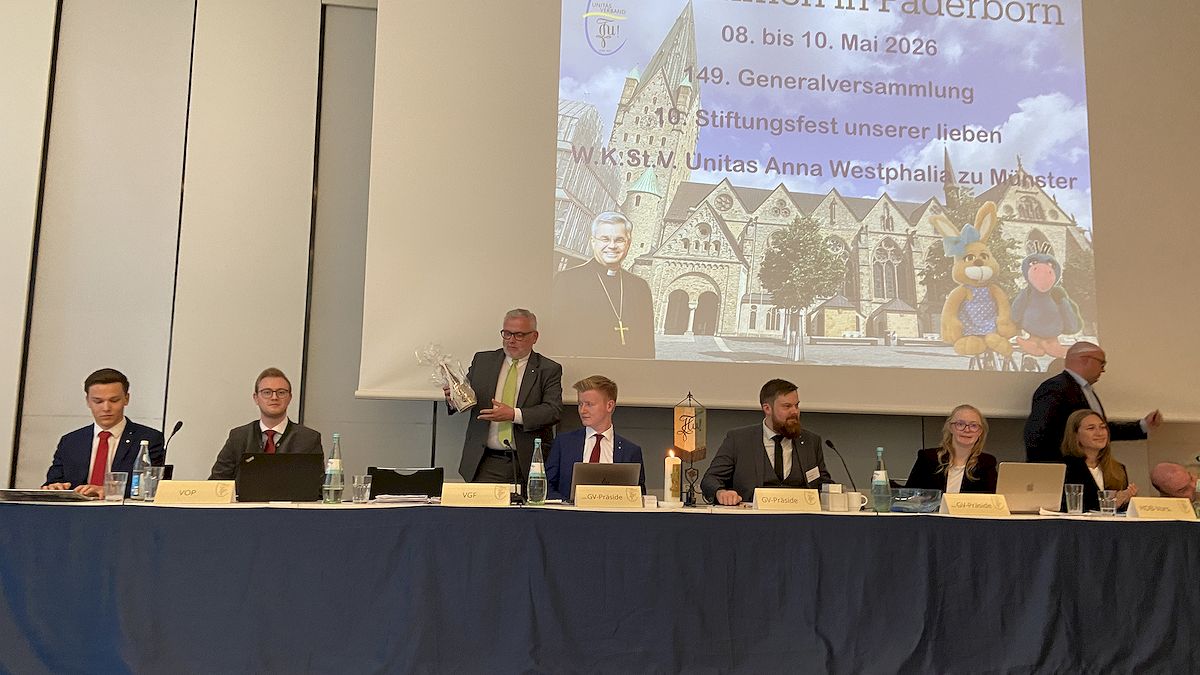 WÜRZBURG. Würdig, fröhlich, engagiert – diese Generalversammlung wäre schwerlich noch zu toppen. Was die Stimmung, die familiäre und wahrlich unitarische Atmosphäre dieses Jubeltreffens zum 150. Geburtstag der Unitas in Würzburg angeht, bleibt sie ganz sicher unvergessen. „Das ist das neue Wir“ bilanzierte der AHB-Vorsitzende Christian Poplutz zum Abschluss überaus treffend – und so wäre zum weiteren Ausbau des inhaltlichen Profil lediglich bereits jetzt schon auf die kommende 149. GV in Paderborn zu verweisen: Unitas Anna Westphalia in Münster wird sie vom 8.-10. Mai 2026 unter dem Motto „Werte-Wille-Wandel – Gemeinsam in die Zukunft“ ausrichten – soweit ein erstes Ergebnis der Beratungen am Main.