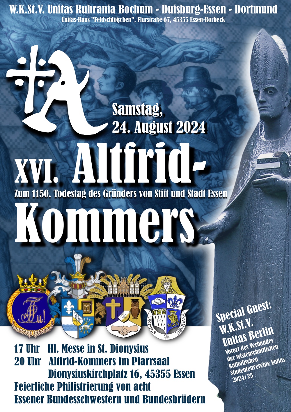 20 Uhr c.t. XVI. Altfridkommers, Pfarrsaal St. Dionysius (Dionysiuskirchplatz 16, 45355 Essen), feierliche Philistrierung von acht Essener Bundesschwestern und -brüdern