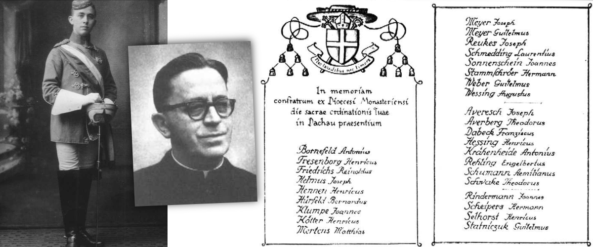 Bbr. Matthias Mertens als Mitglied der UNITAS Sugambria in Münster. Rechts: Das im KZ Dachau entstandene Gedenkbildchen von der Priesterweihe Karl Leisners verzeichnet unter dem Wappen des späteren Münsteraner Kardinals von Galen die anwesenden Geistlichen, unter ihnen außer Mathias Mertens noch drei weitere unitarische Bundesbrüder: Pfarrer Heinrich Fresenborg (M), geb. 02. Mai 1900, gest. 21. März 1986, im KZ Dachau vom 28. November 1941 bis zum 28. März 1945; Generalvikariatsrat Geistl. Rat Heinrich Hennen (I2, M3), geb. 13. Januar 1907, gest. 02. November 1967, im KZ Dachau vom 30. Januar 1942 bis zum 05. April 1945; Pfarrer Heinrich Koetter (I2), geb. 28. Oktober 1910, gest. 15. Juni 1973, im KZ Dachau vom 28. November 1941 bis zum 27. März 1945.