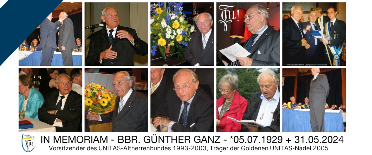 MAINZ. Bbr. Günther Ganz, 1993-2003 Vorsitzender des Unitas-Altherrenbundes (AHB), ist am Morgen des 31. Mai 2024 im Alter von 94 Jahren gestorben. Der Unitas-Verband und seine Vereine trauern um einen großen Unitarier und sind dankbar für das Zeugnis seines Lebens. Er wird am Freitag, 7. Juni, um 12 Uhr in Mainz-Gonsenheim zur letzten Ruhe getragen.