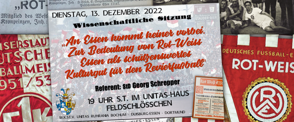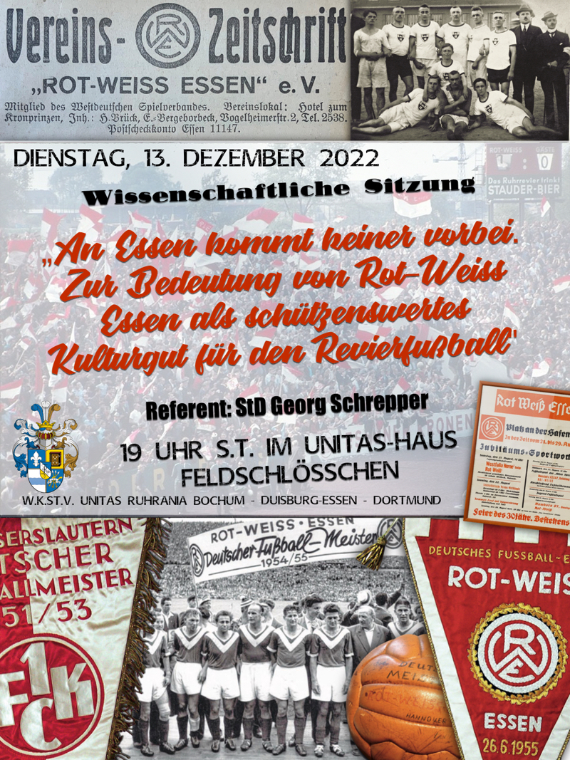 Wer das am besten einsortieren kann, ist am Dienstag, 13. Dezember 2022, bei der Unitas Ruhrania auf dem Platz: StD Georg Schrepper, u.a. Sportlehrer am Borbecker Don Bosco-Gymnasium, ehrenamtlicher RWE-Historiker und Autor der Vereinszeitschrift „Kurze Fuffzehn“, wird bei dem Abend ab 19 Uhr s.t. im Conventsaal des Unitas-Hauses „Feldschlößchen“ an der Flurstraße 67 das „Kulturgut Fußball“ beleuchten und erklären, wie Legenden entstehen.