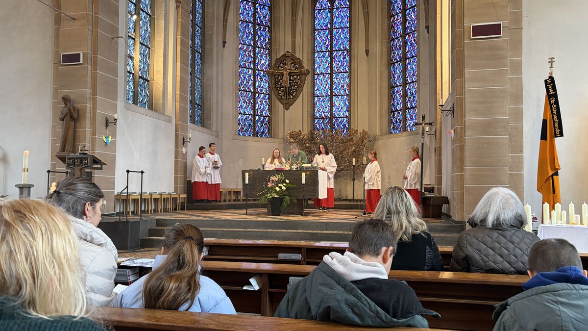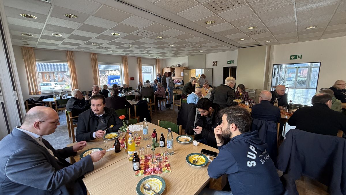 Aktive, AHV-Vorsitz und HBV-Vorsitz, die auch im Namen ihrer Mutter- und Schwestervereine Unitas Salia und Sugambria ihren Respekt für die große Arbeit in der Erstellung der Ausstellung überbrachten, fühlten sich in Schmachtendorf mehr als wohl. Alle Strophen des Steigerlieds zum Blasiussegen, Suppen, Waffeln mit Kirsche und Sahne und manches mehr im Pfarrheim, überraschende Gespräche mit interessierten Gemeindemitgliedern und eine musikalisch wunderschön gestaltete gemeinsame Messe mit Propst André Müller von der Propstei St. Clemens: Er hatte vor der Eröffnung das Wirken von Matthias Mertens in eindringlicher Predigt in den Horizont ganz aktueller Zeitentwicklungen gestellt. In der Messe nannte er die Seligpreisungen als Vorbild für das Lebenszeugnis des unvergessenen Seelsorgers, dem auch mit dieser Ausstellung eine große Wirkung auch heute zu wünschen ist.
