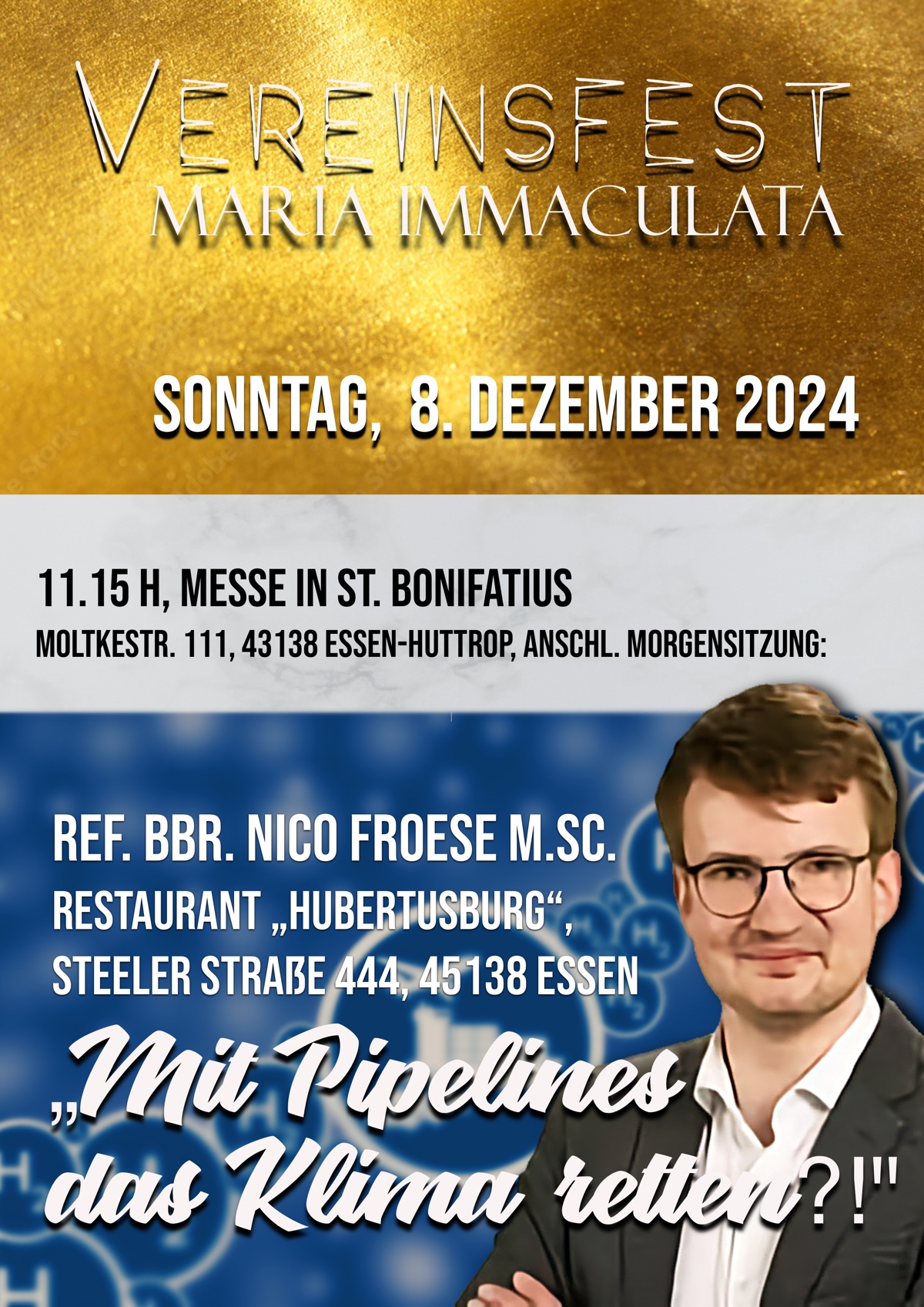 Schon jetzt dürfte der Blick dabei auch auf den kommenden Sonntag gehen: Am 2. Advent, 08. Dezember, wird das für alle verbindliche Vereinsfest St. Maria Immaculata in diesem Jahr um 11.00 mit der Hl. Messe in St. Bonifatius, Essen-Huttrop, Moltkestraße 111, 45138 Essen, beginnen. In der Umgebung der Kirche in der Moltkestraße und auf der Steeler Straße kann man einen Parkplatz finden, unter Umständen verbunden mit etwas Fußweg. Direkt vor der Kirche kann man zum Ein- und Aussteigen anhalten.