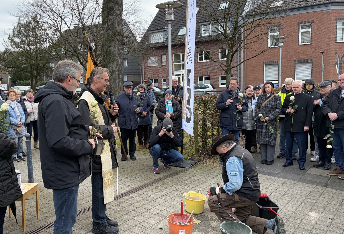 Künstler Gunther Demnig, der inzwischen weit über 100.000 dieser Stolpersteine für Verfolgte und Opfer des Nazi-Regimes in Deutschland, Österreich, der Schweiz und vielen anderen Ländern verlegte, hatte für die um 9 Uhr beginnenden Setzung des Steines vor der Kirche an der Hiesfelder Straße bereits alles vorbereitet. Sie fügt sich in die seit 12. Februar in der Kirche St. Josef Oberhausen-Schmachtendorf laufende Ausstellung: „Kaplan Mertens – Standhaft in bewegter Zeit“, bei der die Unitas Ruhrania ebenfalls vertreten war.