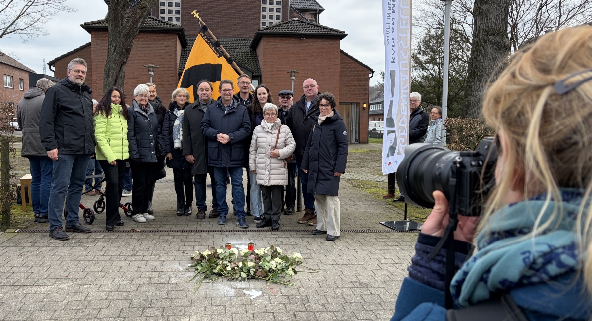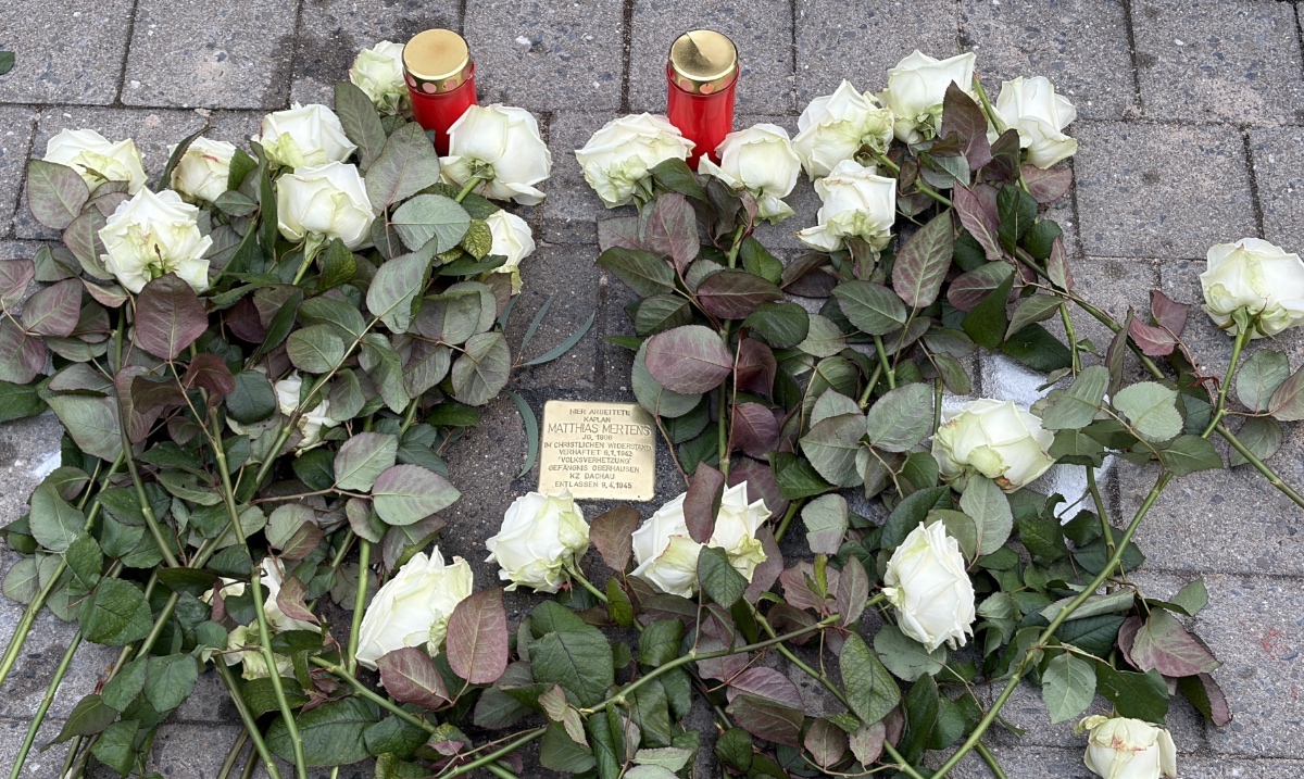 OBERHAUSEN. Am Morgen des 10. Februar 2026 ist in Oberhausen der Stolperstein für Bbr. Kaplan Matthias Mertens verlegt worden. Kurze Worte sprachen Oberhausens Bürgermeister Werner Nakot (CDU) und Thorsten Engler, der Vorsitzende des Fördervereins, bevor Pastor Andreas Rose den neuen Gedenkstein und die Anwesenden segnete. Viele legten an dem Stein im Anschluss weiße Rosen nieder, in Vertretung der Bundesbrüder auch Dr. Christof Beckmann, AHV-Vorsitzender der Unitas Ruhrania und Rainer Langenberg vom Unitas-Zirkel Oberhausen.