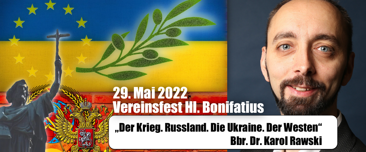 ESSEN. Das Vereinsfest zu Ehren des Hl. Bonifatius am Sonntag, 29. Mai 2022, beginnt um 10 Uhr s.t. mit der Hl. Messe in St. Dionysius Borbeck. Anschließend geht es zur wissenschaftliche Morgensitzung auf das Unitas-Haus Feldschlösschen an der Flurstraße. Das Treffen steht unter dem Vorzeichen der aktuellen Weltlage: „Der Krieg. Russland. Die Ukraine. Der Westen“ ist der Titel der Morgensitzung, die Osteuropa-Experte Bbr. Dr. Karol Rawski übernommen hat.