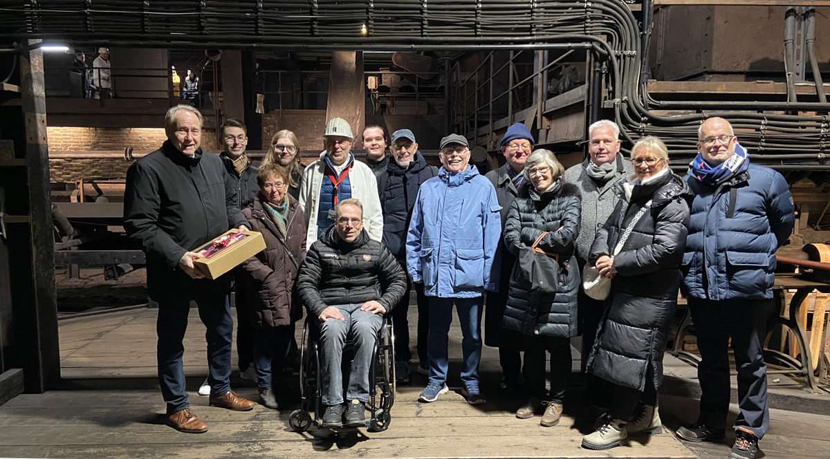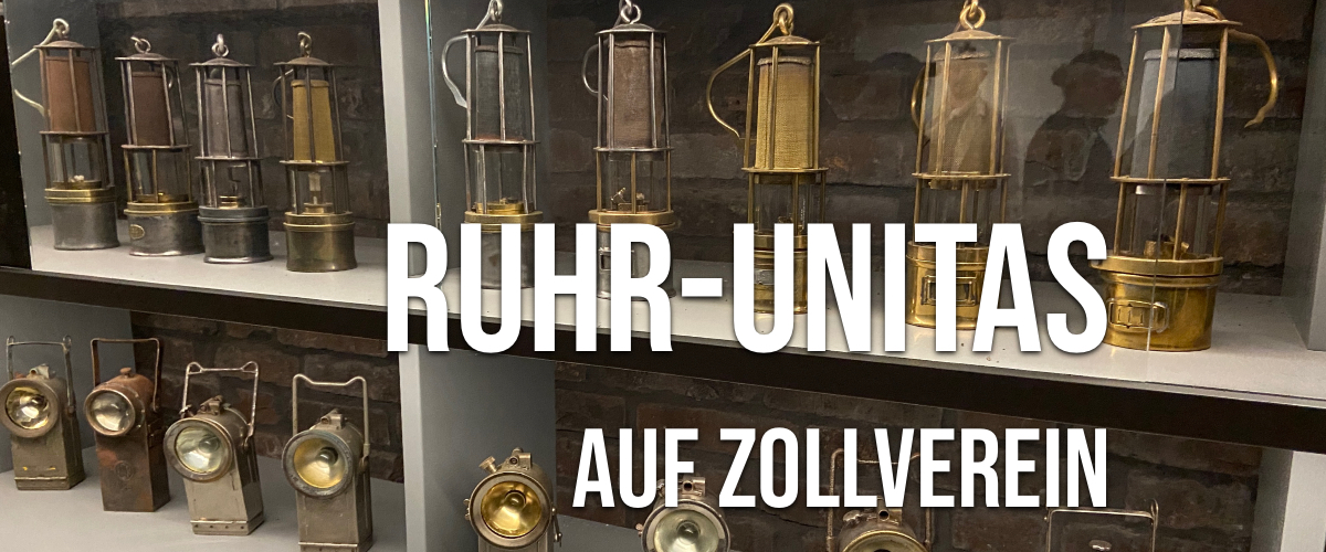 Das brauchte es diesmal nicht. Mit einem Weingebinde und großem Dank an den Steiger und Bbr. Ralf Bockstedte v/o Politikos, der die Tour eingestielt hatte, gings über die große Rolltreppe wieder auf Normalhöhe. Ein „Glückauf“ mit Steigerlied schallte im Fahrstuhlschacht und zuletzt empfing die Gastronomie im „The Mine“ die durchgefrorene Unitas-Truppe. Kein Vergleich zu den 45 Grad, die es unter Tage gewesen wären. Aber eine Exkursion, die zeigte, was aus einem Rostmammut vergangener schwerindustrieller Zeiten zuletzt sogar noch werden kann: Eine Location, in der sich hippe Designer, kulturbeflissene Ausstellungsbesucher und fesche Hochzeitspaare gleichermaßen gut aufgehoben fühlen. Und Unitarier natürlich auch, die im Schatten des Doppelbocks ihren ganz eigenen Doppelbock genießen können.