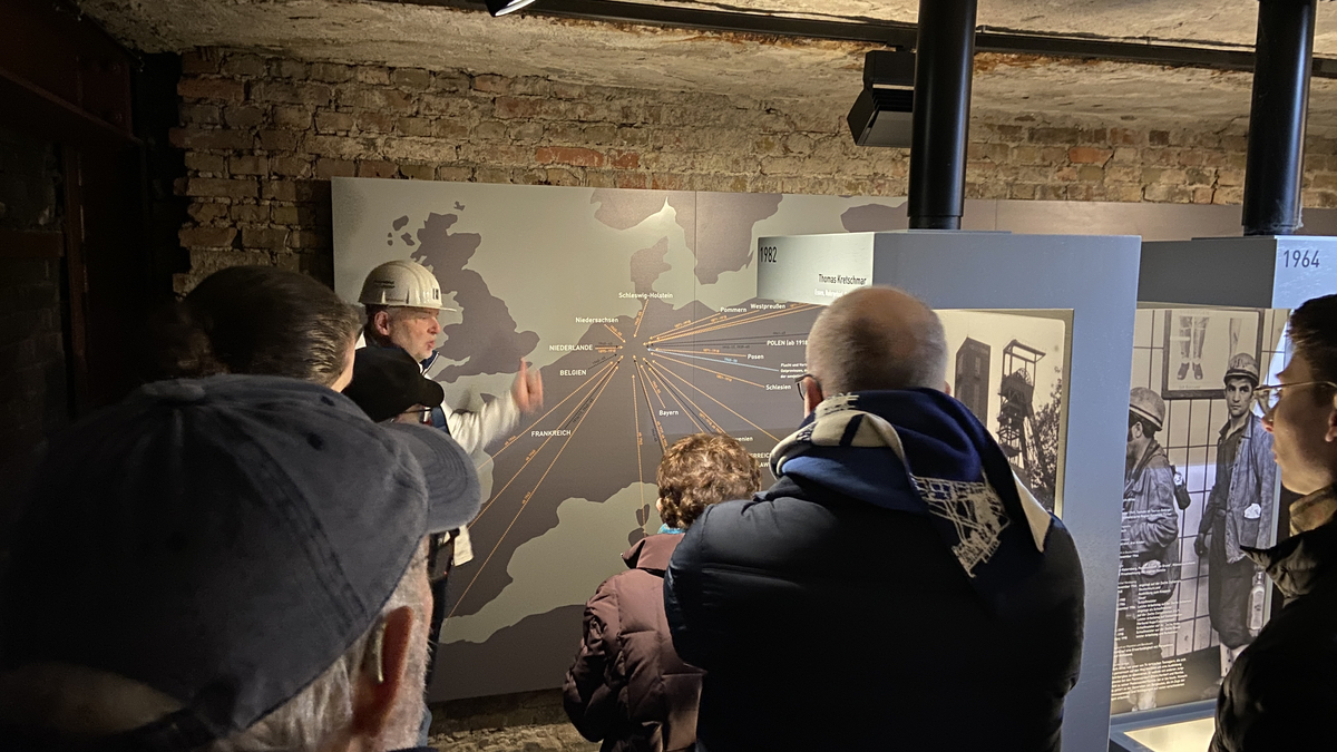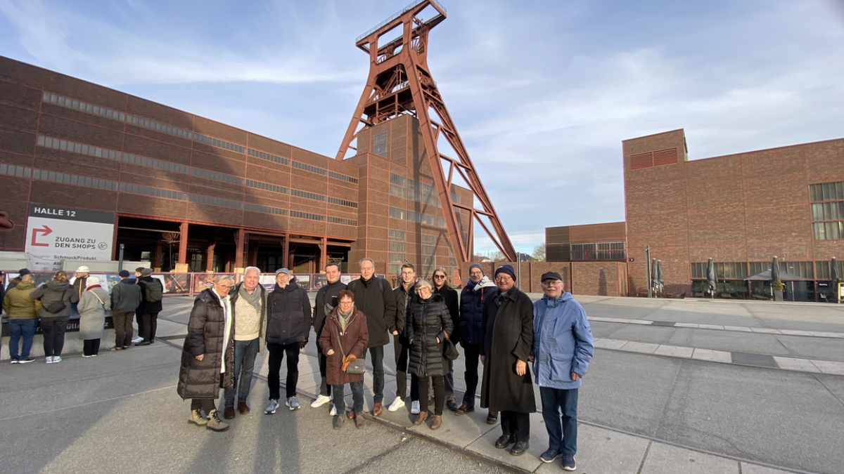 ESSEN. „Das dreckige Dutzend“ - so hätte man die erwartungsvolle Truppe wohl genannt, wenn es für sie tatsächlich unter Tage gegangen wäre. So weit ging es am Samstagnachmittag, 22.11.2025, für die Ruhr-Unitas aber nicht. Beim entspannten Geländeschlendern übers Areal der Zeche Zollverein waren es allerdings schließlich doch ein paar Grad frischer als das Thermometer anzeigte, vor allem auf dem windgezausten 45 Meter hohen Dachplateau. Von dort schweifte der Blick frei über die aus Abraum aufgetürmten Revieralpen und das massiv tiefergelegte Revier zwischen Duisburg, Gelsenkirchen und Dortmund, das der Unitas zu Füßen lag.