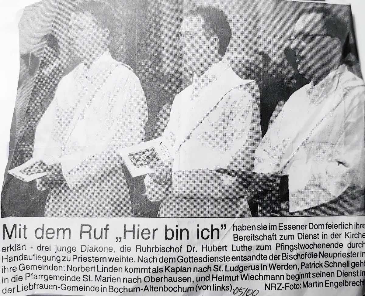 Am Freitag vor dem Pfingstfest im Hl. Jahr 2000 weihte Bischof Dr. Hubert Luthe Helmut Wiechmann im Essener Dom zum Priester. „Alles, was ihr von jetzt an als Priester sagt und tut, ist allein sein Wort und sein Werk", sagte der Ruhrbischof den drei Neupriestern in seiner Predigt. Das sei die Last ihres Lebens, aber zugleich Gottes überquellendes Geschenk: „Wir danken euch, dass ihr euch der Hand Gottes stellt für uns, seine Kirche, und wir versprechen euch, mit euch Christen zu sein, damit ihr für uns Priester sein könnt.“