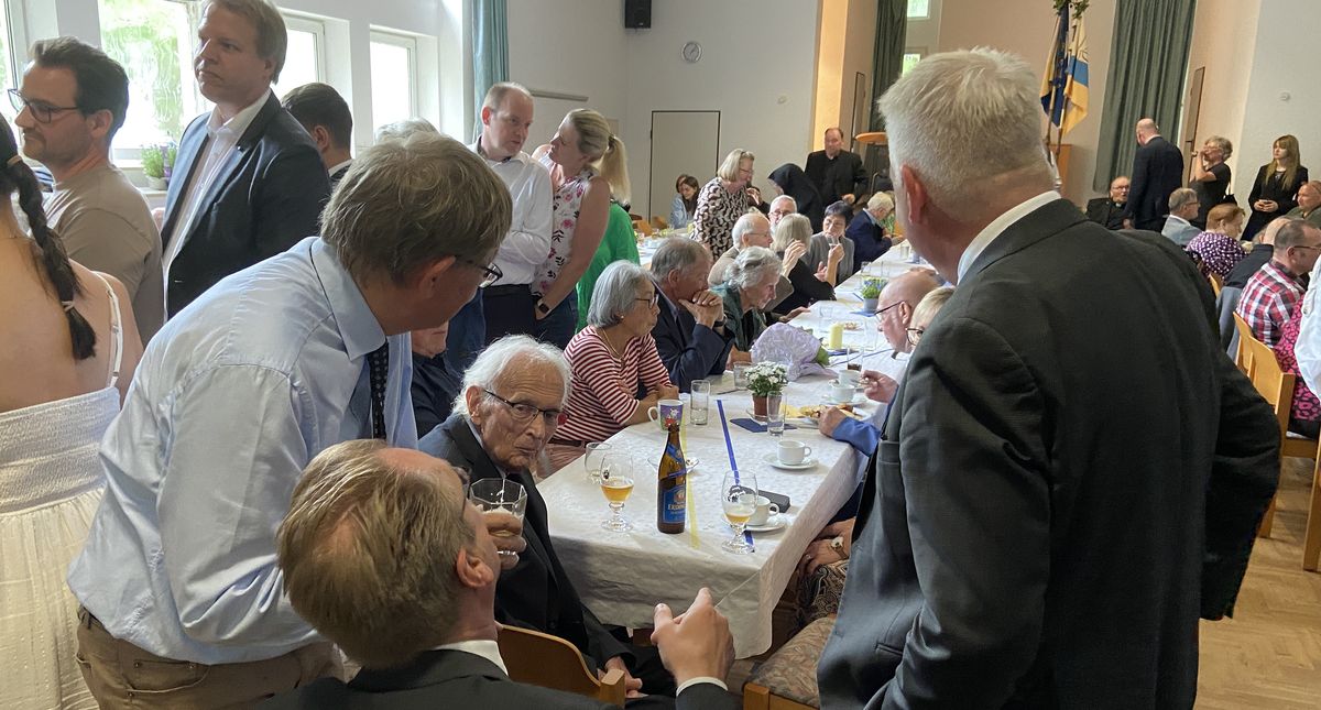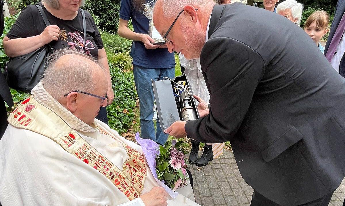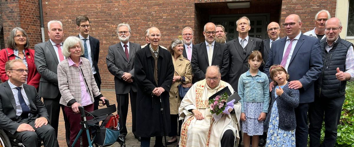 Der langjährige Verbandsseelsorger des Unitas-Verbandes, Wiederbegründungssenior der Unitas Ruhr, predigte zum Dreifaltigkeitssonntag. Seine Gedanken wären allemal noch mal nachlesenswert. Auch für die musikalische Mitgestaltung der Messe konnte die Ruhr-Unitas wie vor 25 Jahren sorgen: Bbr. Bernd Brinker, wie viele Mitfeiernde von weit her gerne angereist, spielte die Trompete. Alle Gäste, Weggefährten und Freunde gratulierten selbstverständlich heftig und natürlich gab´s zum Festtag von seinen Unitariern dazu eine Grubenlampe.