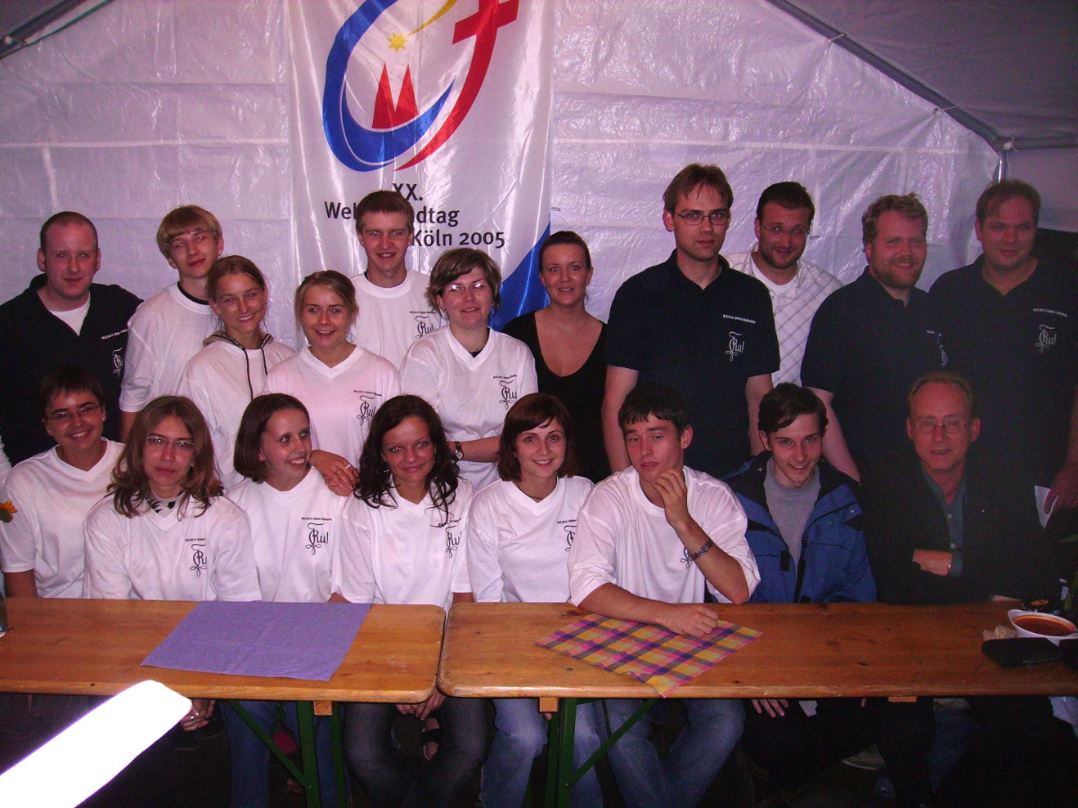 Zwei große Zelte im Biergarten, Schirme und Beleuchtung, ein großer Bierwagen, Musikanlage, ein Riesenbüffet und mehr sorgten beim offiziellen Begrüßungsabend am 11. August für tolle Stimmung, so der Bericht nach dem großen Ereignis: „Tat man sich beim WJT-Song, dem ersten „Venimus adorare“ zur Gitarre noch schwer, so stimmten bald schon die gesamten Messdiener, Pfadfinder, Jung-Unionisten, Kolpingbrüder und Ehrengardisten samt Pfarrer und Vikar in den Gesang ein. Keine Frage, dass auch in den nächsten Tagen bis zur Abschlussfete das Ruhranen-Haus der feste Treffpunkt für viele der Gäste und Gastgeber war. Immer standen die Bundesbrüder zur Verfügung, frisch gewandet in einheitlichen blauen Poloshirts und sofort an Schriftzug und Zirkel erkennbar. Viele gemeinsame Erlebnisse, die Messen, unzählige Gespräche und Begegnungen bis zum Abschied am 15. August haben unvergessliche Tage geprägt. Die eigenen Gäste trugen stolz das UNITAS-Zeichen auf eigens angefertigten T-Shirts und ein paar Tränen wurden durchaus verdrückt, als es für sie auf nach Köln ging. Mit einer fünfköpfigen Abordnung folgten die Ruhranen an den Rhein, eine eigene Fahne im Gepäck. Auch sie hatten bei ihrer Heimkehr viel zu erzählen.