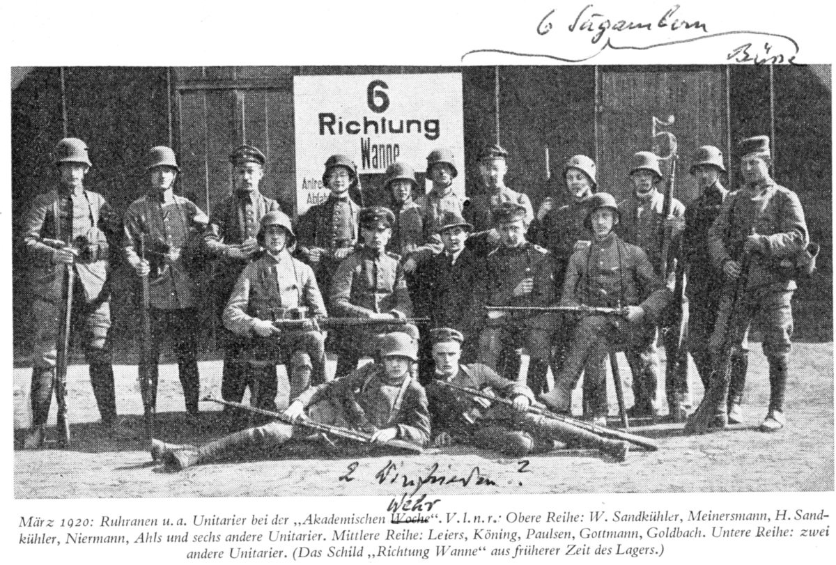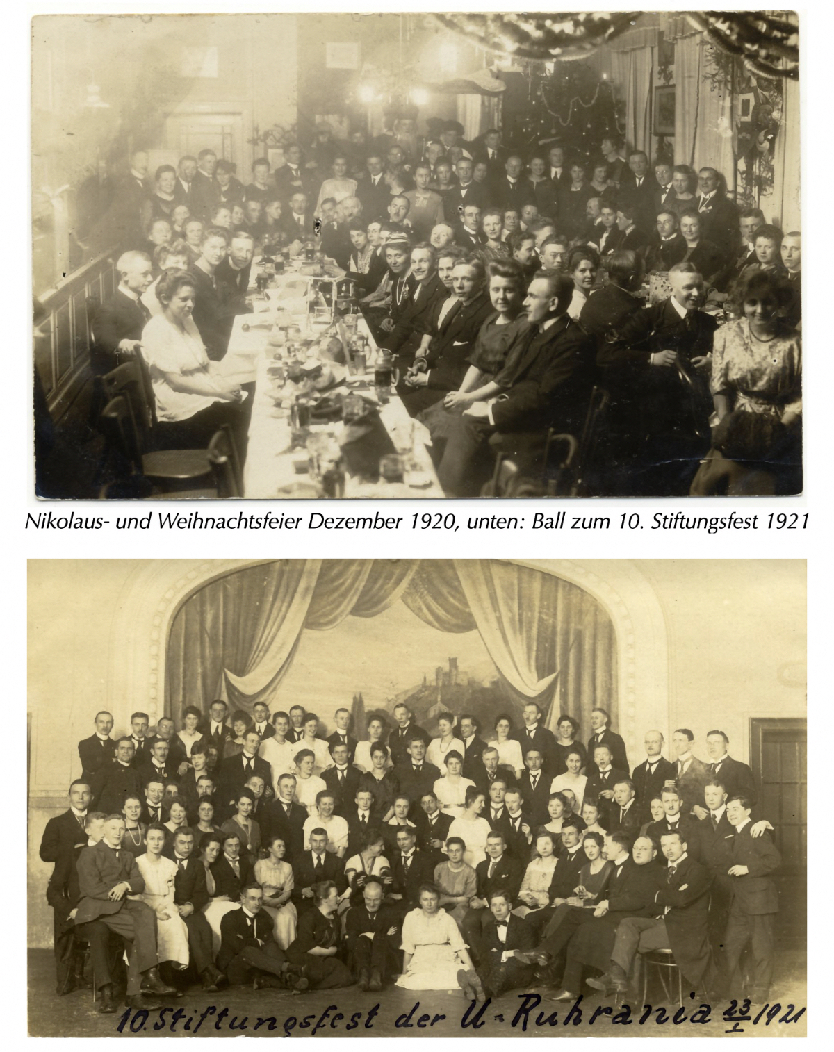 Kurze Nachforschungen ergaben erste Anhaltspunkte zur Vita der beiden, die beide etwa gleich alt waren und der Unitas Ruhrania in einer außergewöhnlich intensiven Zeit angehörten. Denn fast alle der 40 aktiven Mitglieder des Studentenvereins waren im Ersten Weltkrieg als Soldat eingezogen, die Gründergeneration war an der Front geblieben. Erst ab 1919 konnte wieder mit sechs Mann den Betrieb aufgenommen, ein Altherrenverein gegründet und eine Konstante in der „Kreuzschanze“ aufgeschlagen werden. Sofort stießen mehr als ein Dutzend Neumitglieder dazu. Die Chargen arbeiten im ASTA und vor allem im Münsterschen UV mit, dessen Vorsitz auch der Ruhrania zufallen sollte.