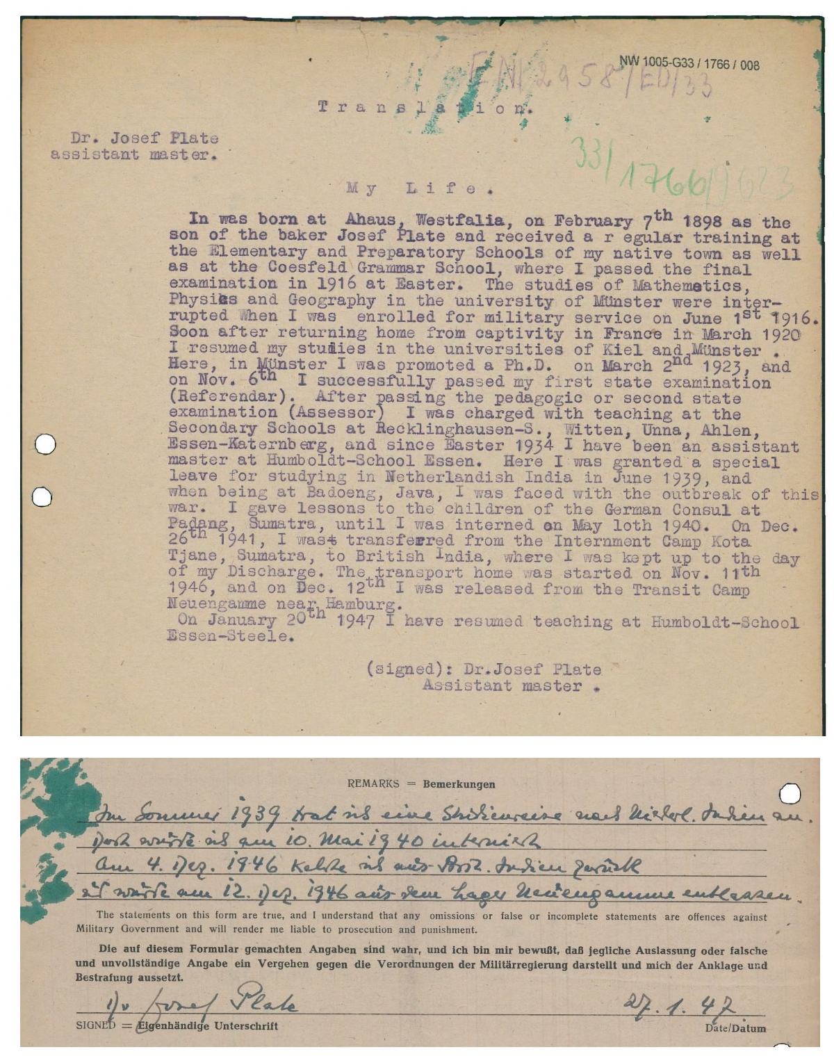 (2) Angaben zum Lebenslauf aus eigener Hand in: (1766) Entnazifizierung Josef Plate, geb. 07.02.1898 (Studienrat), Verzeichnungseinheit: Abt. Rheinland, NW_1005-G.33 (SBE Hauptausschuss Stadtkreis Essen), Nr. 1766, Anzahl Bilddateien: 11, in: https://www.archive.nrw.de/archivsuche?link=VERZEICHUNGSEINHEIT-Vz_dd303c2b-bca4-4017-b7df-af29d8d75009