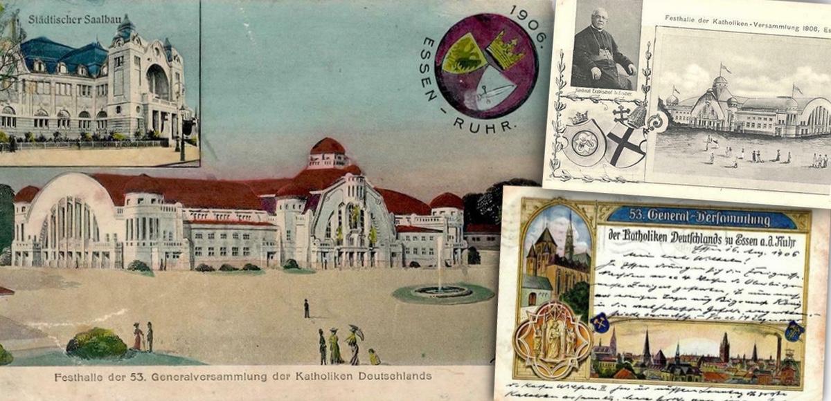 Was den meisten Bundesbrüdern und Bundesschwestern heute bekannt sein wird, war erst recht präsent, als sich der Verband 1906 zum ersten Mal mitten in der Heimat der Gründer versammelte: Wie üblich, trifft man sich damals im Rahmen eines anderen großen Ereignisses, das maßgeblich von unitarischen Persönlichkeiten bestimmt wird. Für den 53. Deutschen Katholikentag in Essen vom 19.-23.8.1906 ist in der Ruhrmetropole eigens eine riesige Halle errichtet und vom 17.-22. August tagen die Unitas-Delegierten zu ihrer 47. Generalversammlung. GVP ist Alfred Miller von Unitas-Burgundia in Münster, der Vorort wechselt damals von Unitas-Freiburg (VOP Joseph Növer) zu Unitas-Würzburg (VOP Joseph Lehrieder) und ein begeisterter Wahl-Essener sendet damals ein Grußwort: