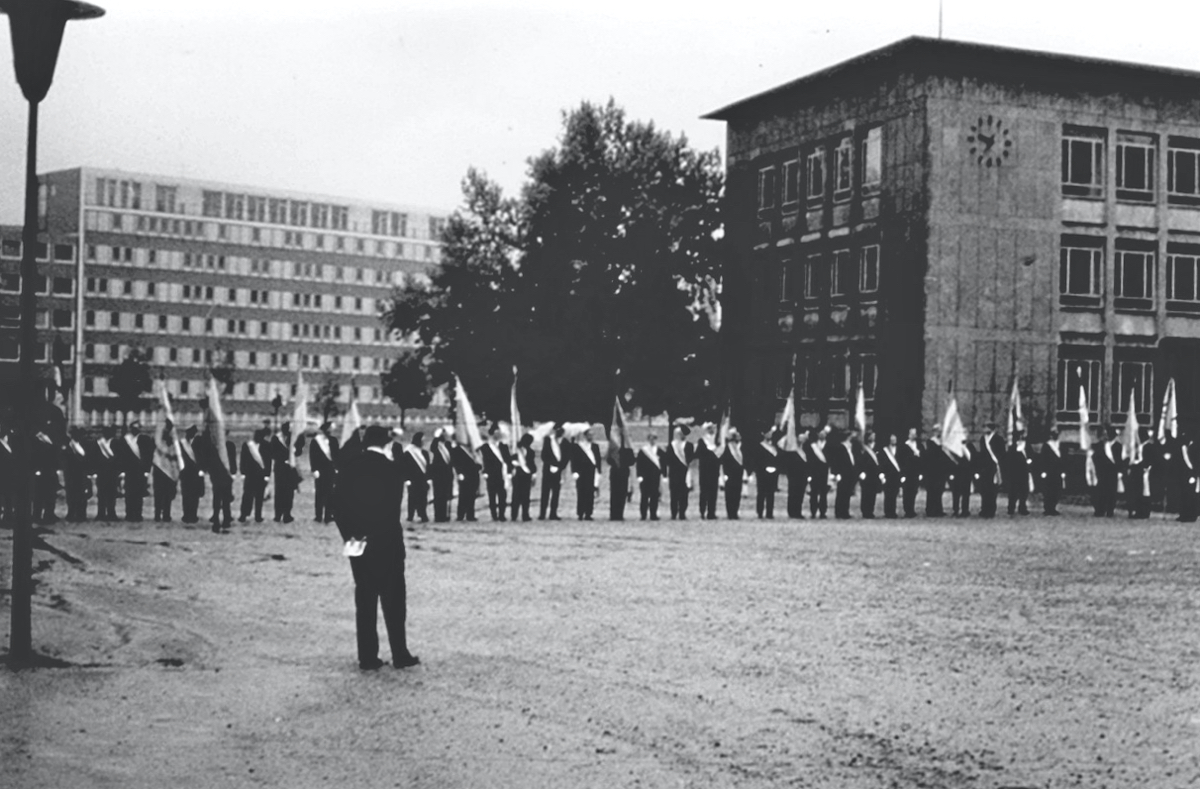 Aufmarsch am Burgplatz: 68 Unitas-Korporationen treten vor dem Pontifikalhochamt 1961 in Essen an