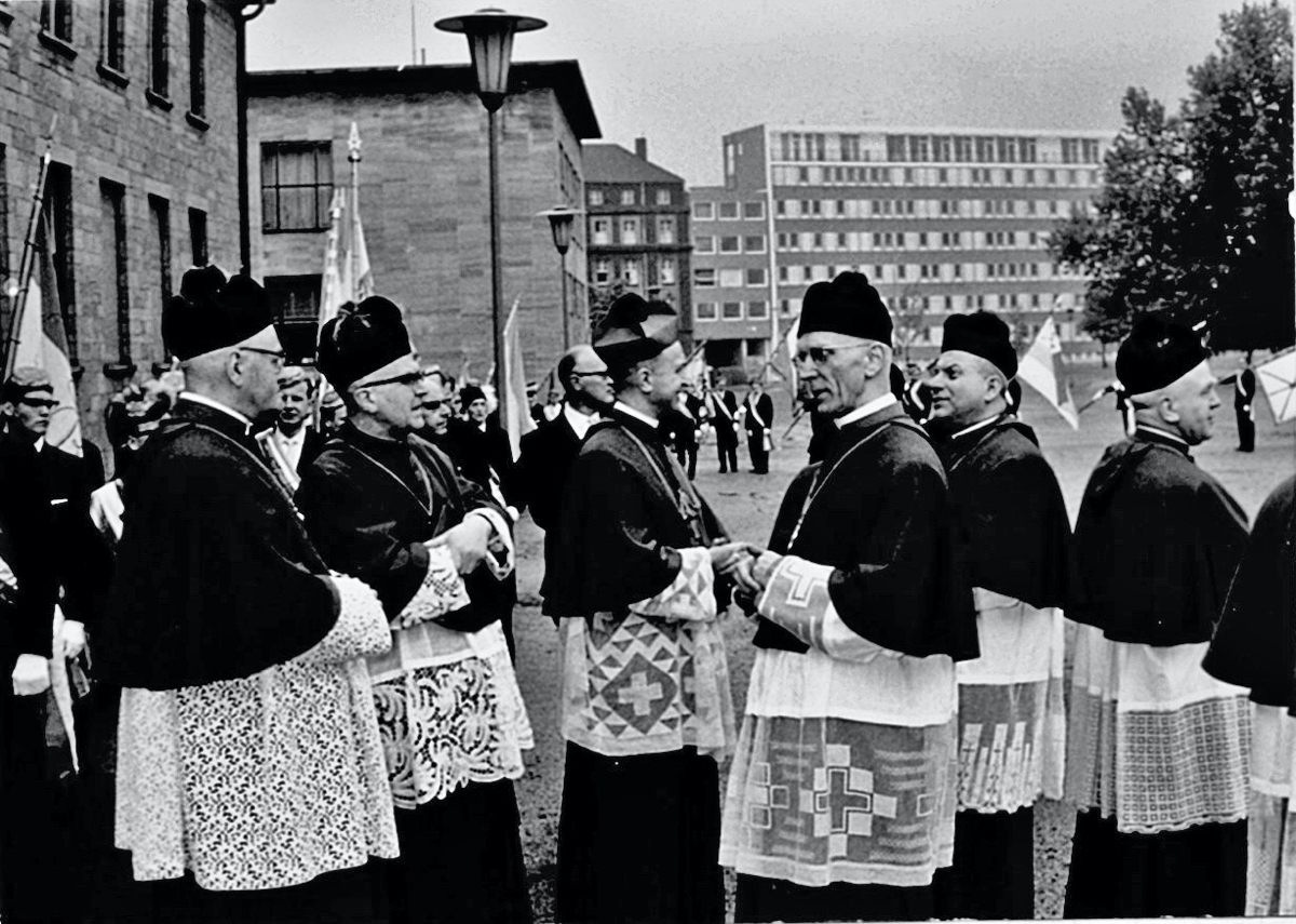 Vor der Festmesse zur 84. GV inEssen: Bischof Franz Hengsbach (Mitte) und Offizial Bbr. Bernhard Mäkel daneben rechts
