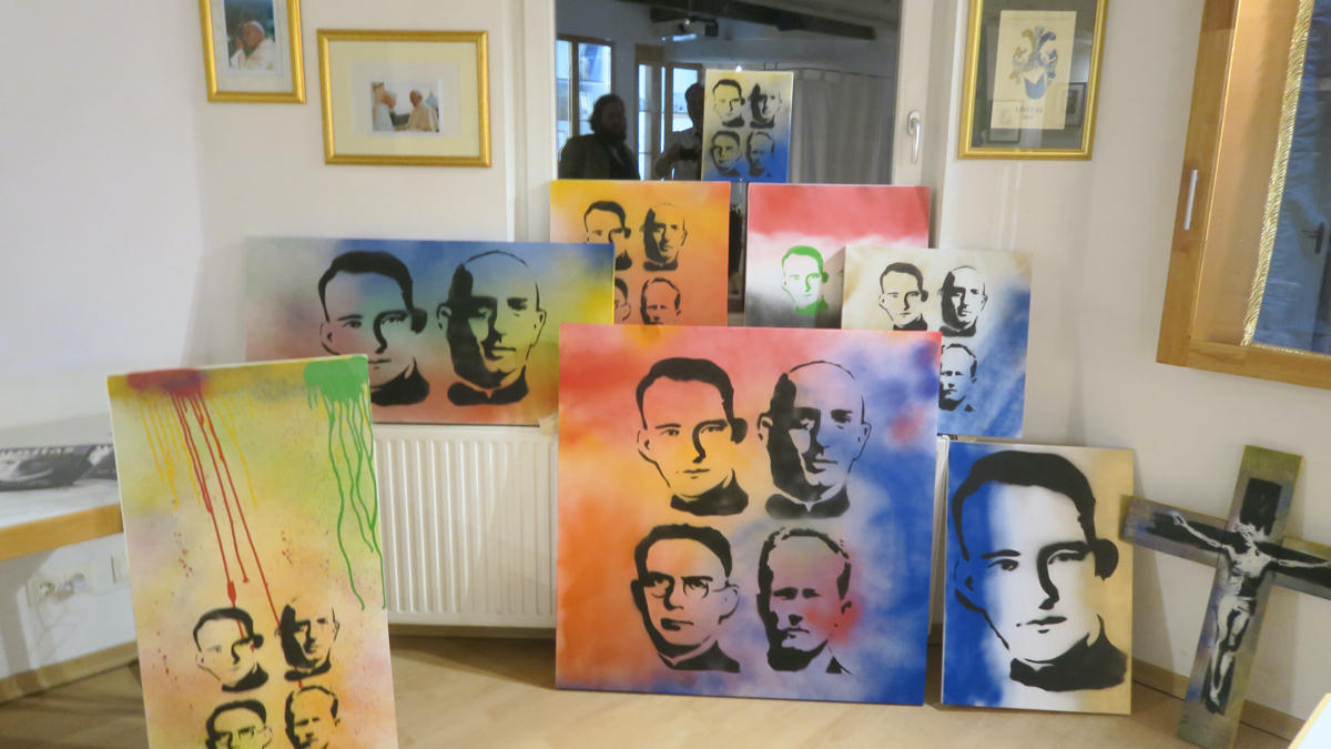 Kunstaktion 2018 zum Thema „Lübecker Märtyrer": Zwei der vier Geistlichen, die von den Nationalsozialisten für ihre Kritik am Regime zum Tode verurteilt wurden, gehörten der Unitas Ruhrania an. Sie wurden im Juni 2011 von der Katholischen Kirche seliggesprochen.